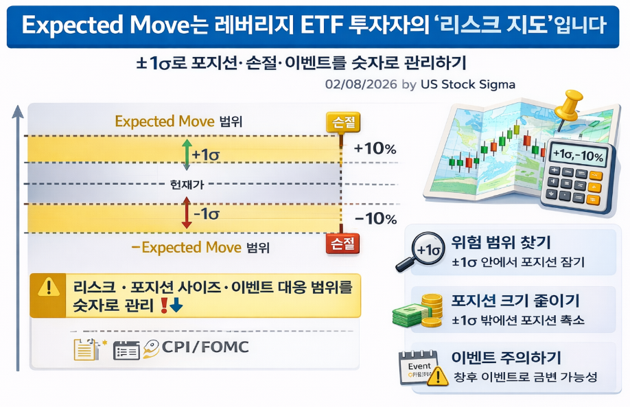 본 글은 정보 제공 및 교육 목적이며 투자 조언이 아닙니다. Expected Move 및 ±1σ 범위는 추정치로, 실제 시장은 범위를 벗어나 크게 변동할 수 있습니다. 레버리지/인버스 ETF는 손실이 빠르게 확대될 수 있으며, 스프레드·유동성·괴리·비용 등으로 인해 계산 결과와 실제 손익이 다를 수 있습니다. 모든 투자 판단과 책임은 이용자 본인에게 있습니다.