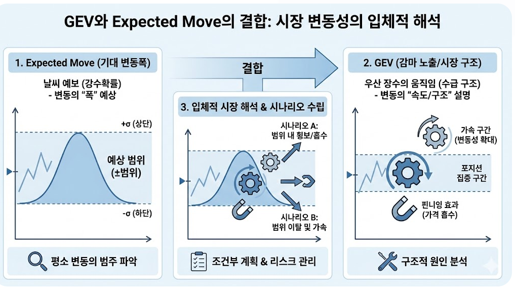 GEV는 옵션 시장의 포지션 구조(특히 감마 노출, GEX/감마 기반 지표를 포괄적으로 부르는 표현)를 통해 “가격이 움직일 때 시장 참가자들의 헤지·재조정이 어떻게 작동할 수 있는지”를 가늠하는 접근입니다. 쉽게 말해 Expected Move가 ‘날씨 예보의 강수확률’이라면, GEV는 ‘바람이 불면 우산 장수가 어떻게 움직일지(수급 구조)’를 함께 보는 개념입니다.